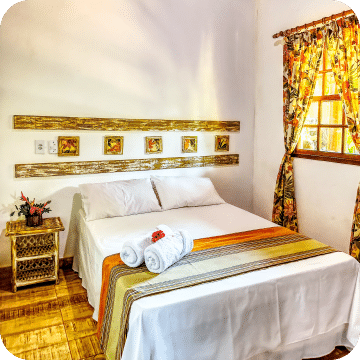 Escolha entre duas configurações: uma cama de casal e uma de solteiro, ou três camas de solteiro. Todos os chalés contam com ar-condicionado, roupeiro, frigobar, banheiro privativo e uma rede na varanda para relaxar após os passeios pela Chapada Diamantina. Reserve seu chalé triplo em Lençóis e aproveite uma estadia aconchegante, próxima à natureza.